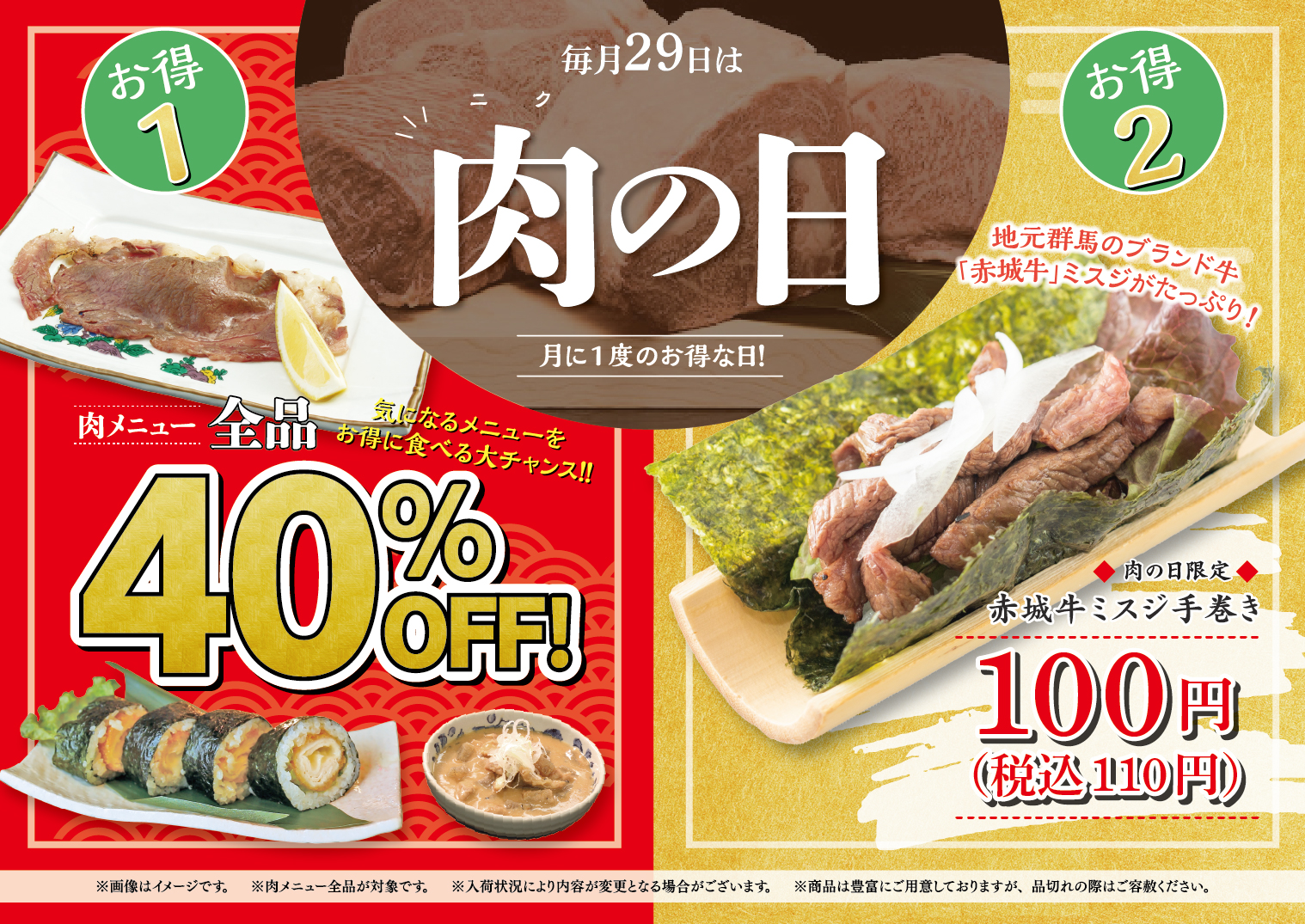 お知らせ 2025.11.29 【毎月29日】お得な肉の日! お知らせ群馬いちもん金沢まいもん群馬を握る、まぐろ問屋いちもん \ 毎月29日は肉の日 / 大人気の肉メニューがなんと全品40%OFFに!! 月に一度やって来る、赤字覚悟のお得イベント🍖 ぜひこの機会をお見逃しなく! 皆様のご来店をお待ちしております♪ お知らせ一覧へ戻る
