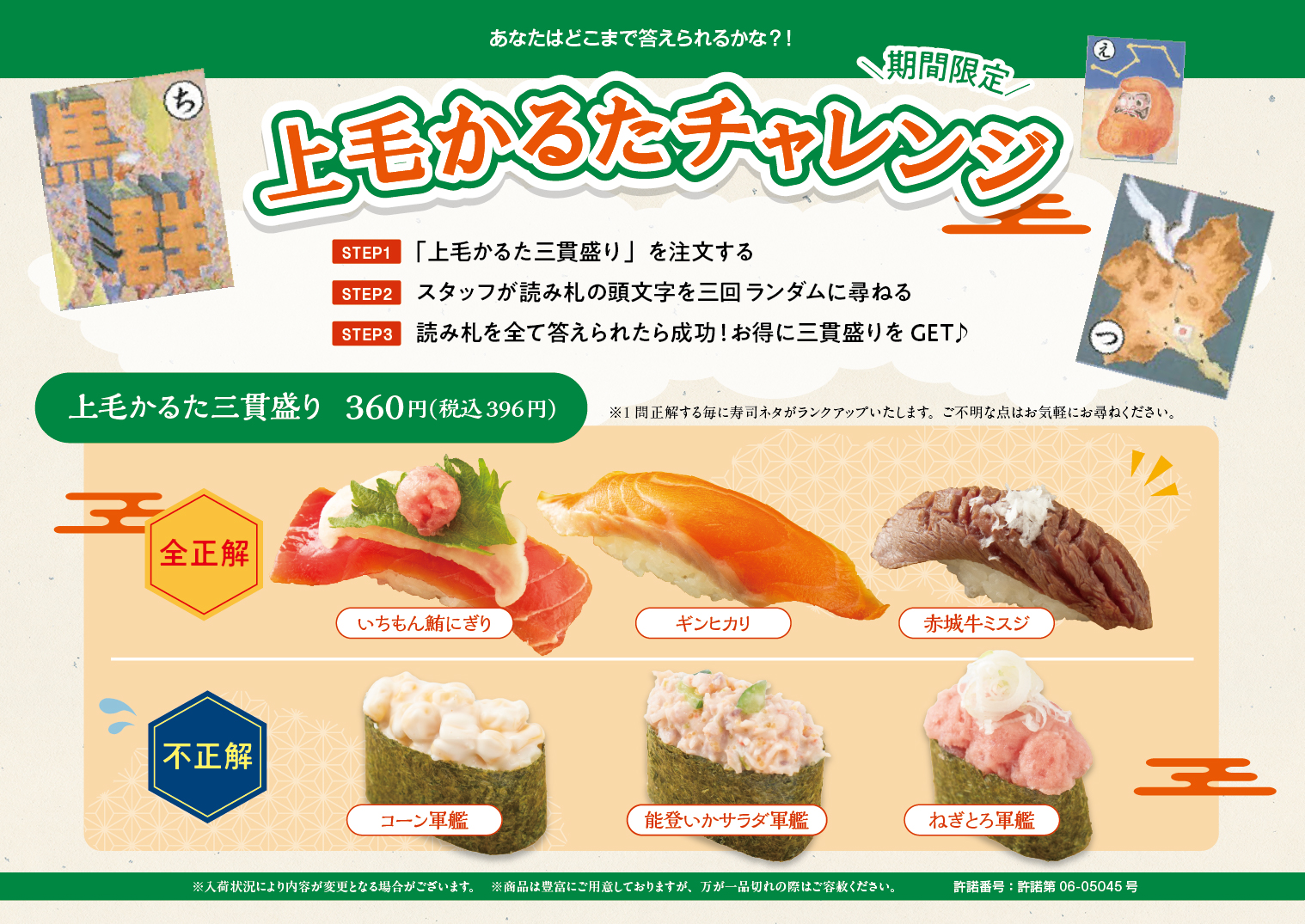 上毛かるたの読み札の頭文字が3問出題され、全て答えられたらお得に三貫盛りがGETできます♪