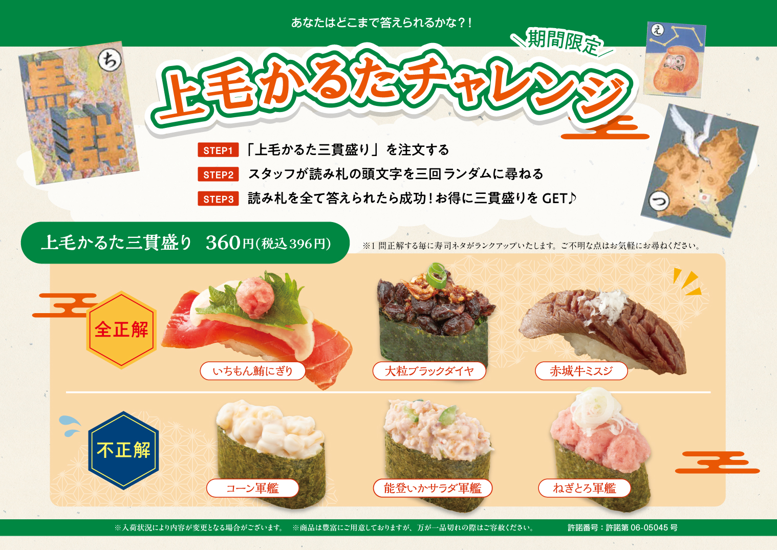 上毛かるたの読み札の頭文字が3問出題され、全て答えられたらお得に三貫盛りがGETできます♪