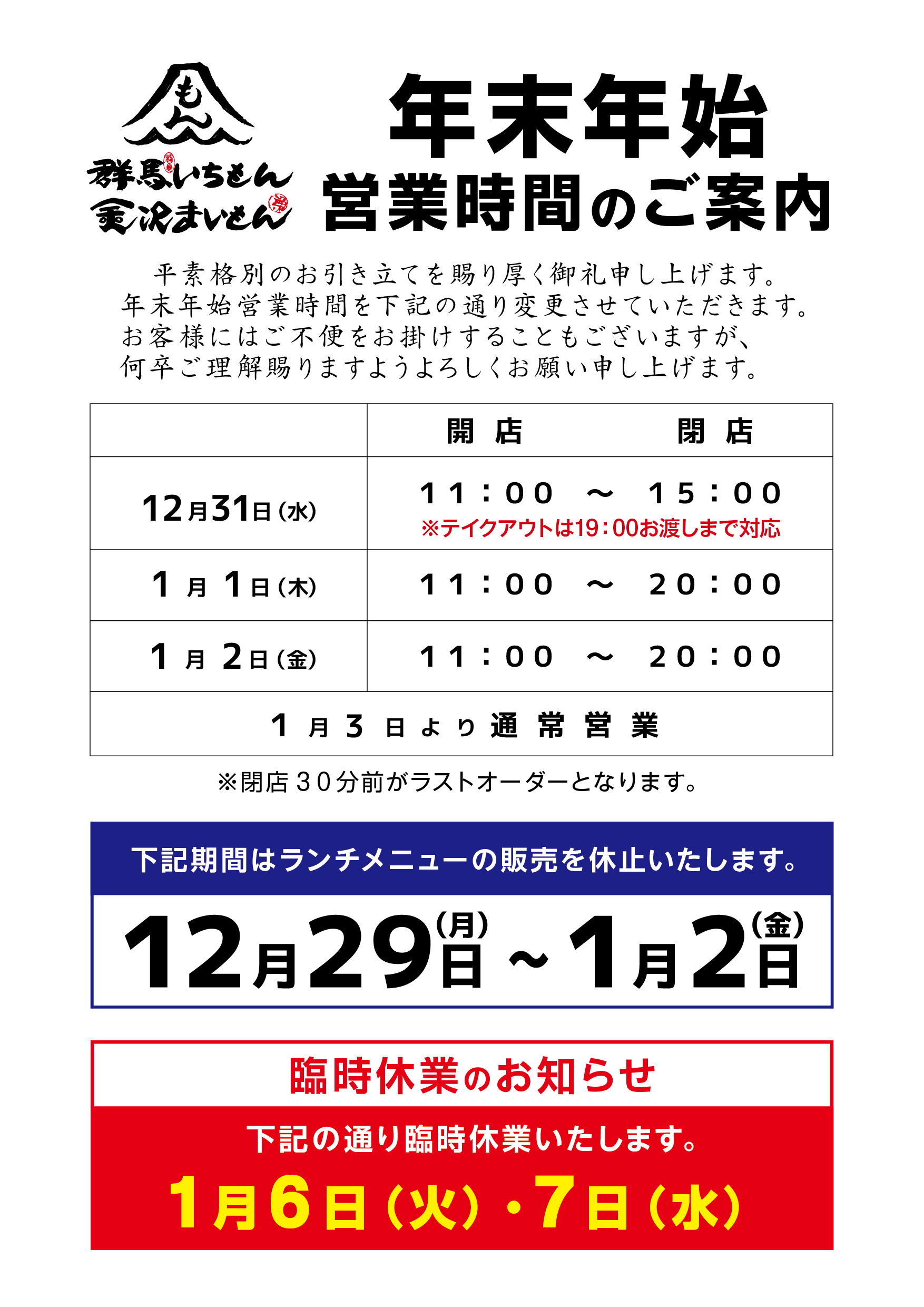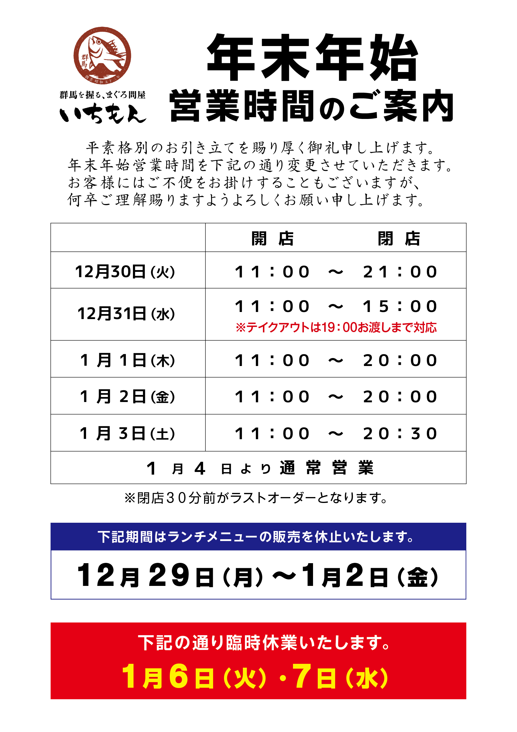 群馬を握る、まぐろ問屋いちもん全店舗ならびに群馬いちもん金沢まいもんスマーク伊勢崎店にて、年末年始は下記の通り営業時間を変更いたします。