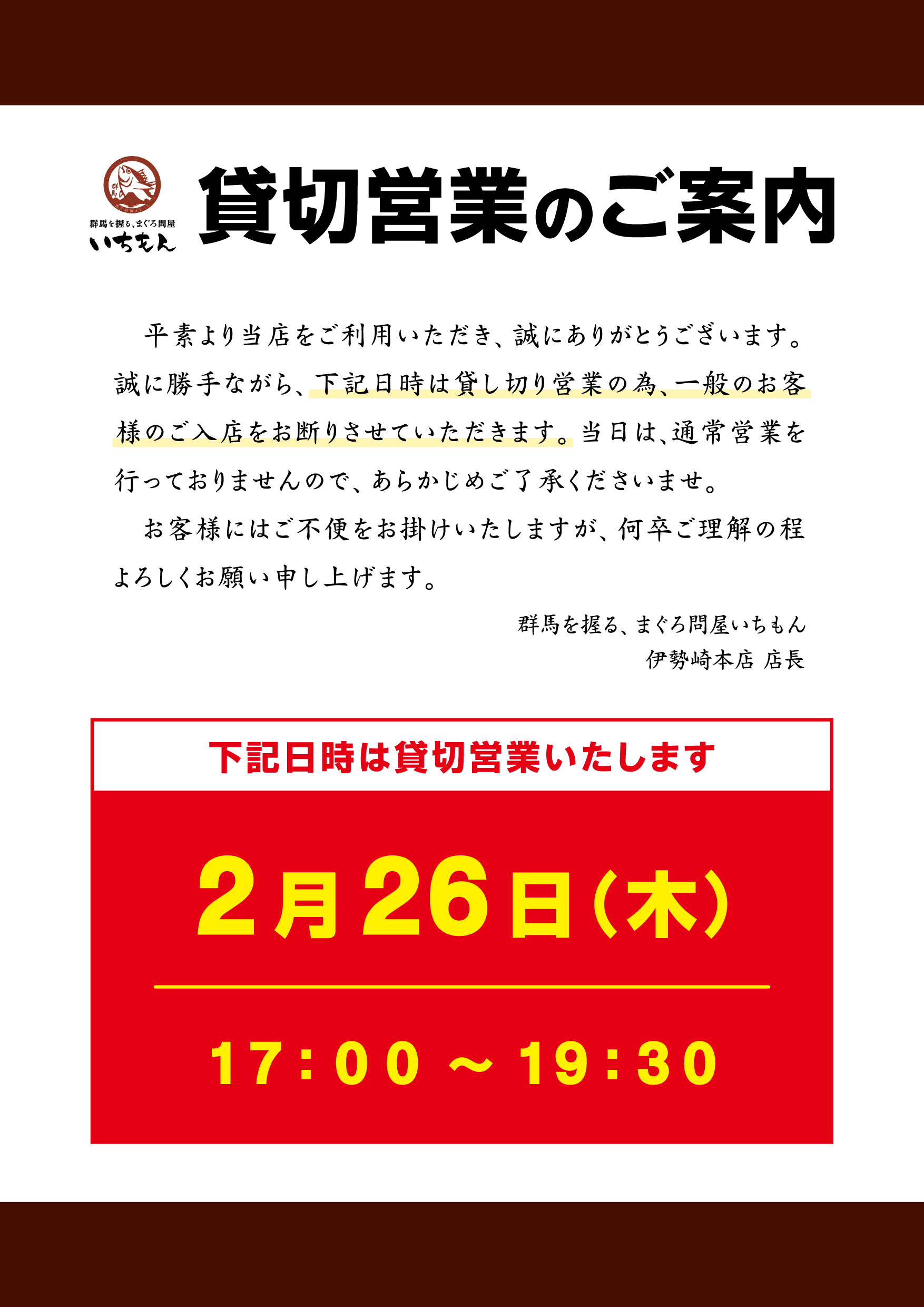 誠に勝手ながら、伊勢崎本店にて、下記日時は貸し切り営業の為、一般のお客様のご入店をお断りさせていただきます。